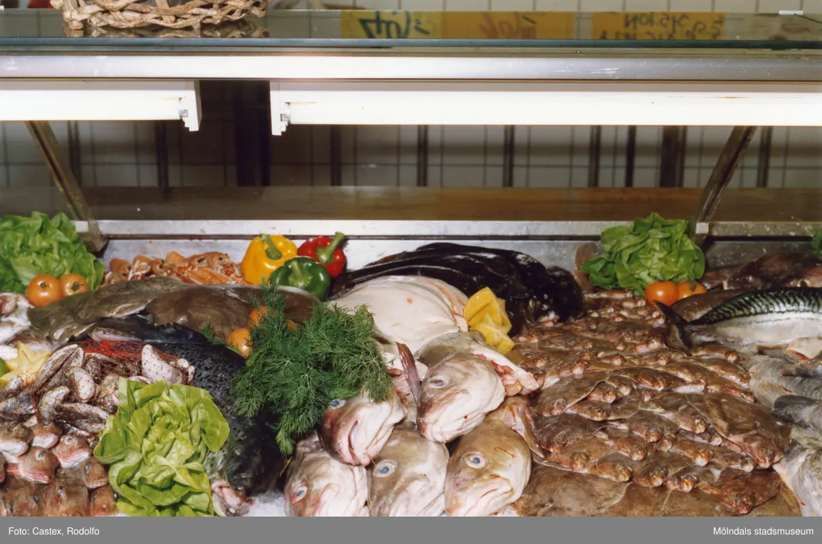 Titel: Fiskaffären i Mölndals centrum den 10 maj 1991. Närbild på fisk i fiskdisken.