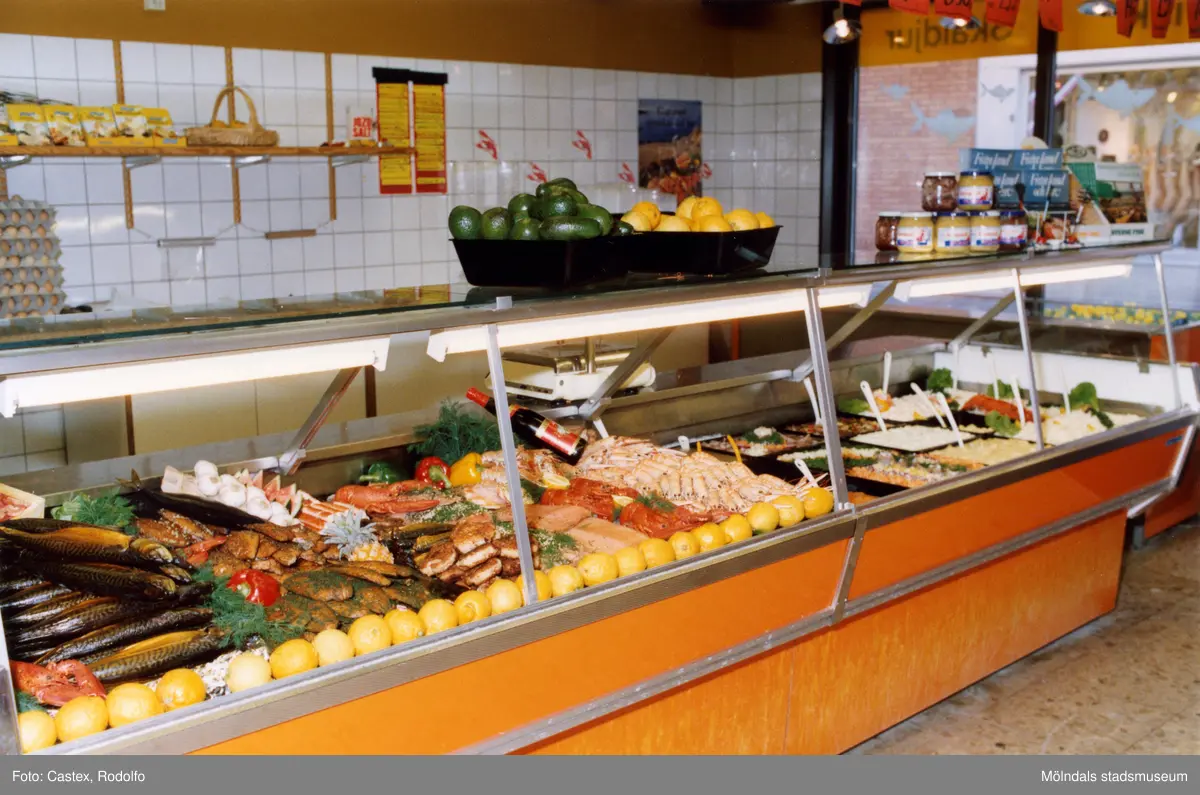 Titel: Fiskaffären i Mölndals centrum den 10 maj 1991. Fiskdisken full med fisk och skaldjur.