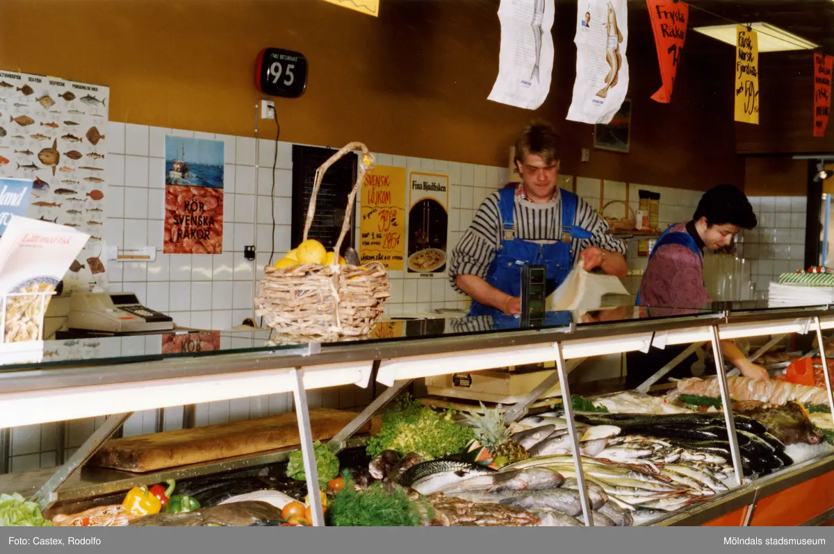 Titel: Fiskaffären i Mölndals centrum den 10 maj 1991. Butikspersonal bakom disken.