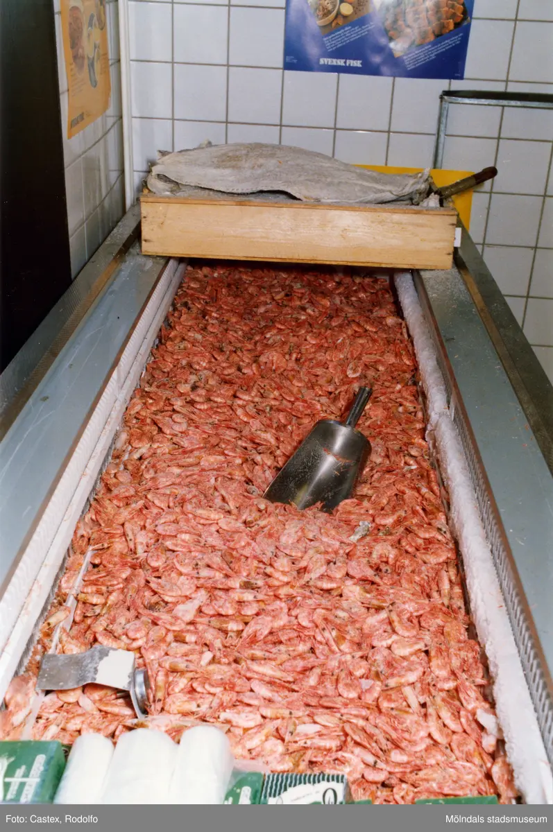 Titel: Fiskaffären i Mölndals centrum den 10 maj 1991. Närbild på räkor i disken.