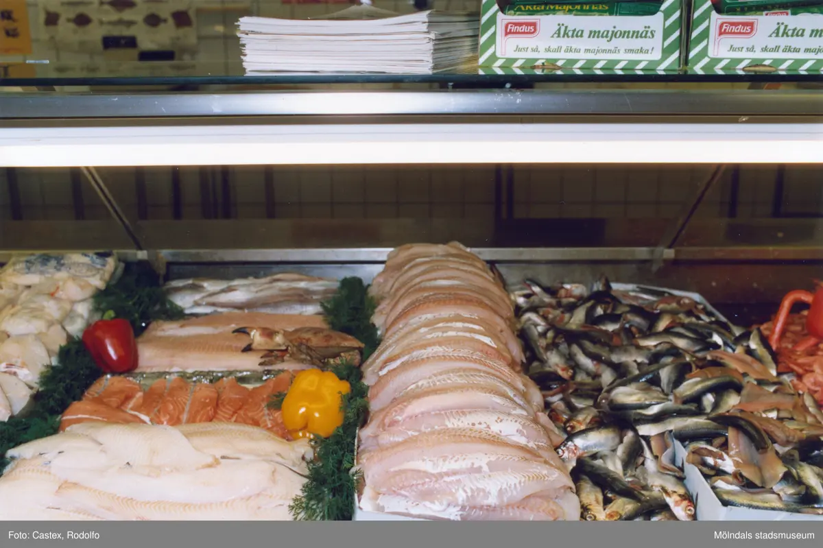 Fiskaffären i Mölndals centrum den 10 maj 1991. Närbild på fiskar och fiskfiléer i fiskdisken.