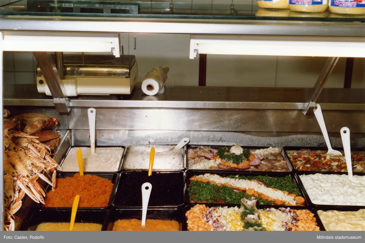 Titel: Fiskaffären i Mölndals centrum den 10 maj 1991. Närbild på diverse delikatesser i fiskdisken.