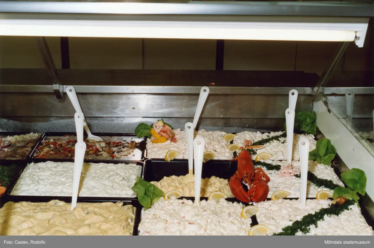 Fiskaffären i Mölndals centrum den 10 maj 1991. Närbild på diverse delikatesser i fiskdisken.