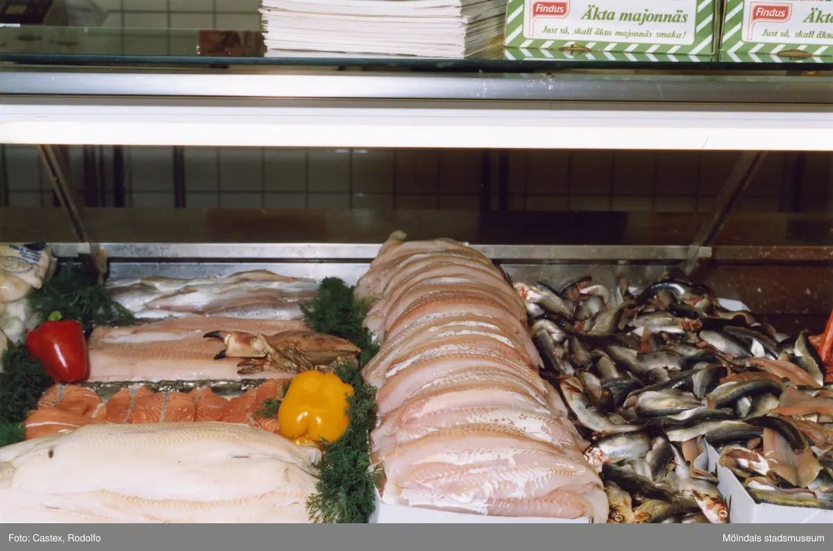 Titel: Fiskaffären i Mölndals centrum den 10 maj 1991. Närbild på fiskar och fiskfiléer i fiskdisken.