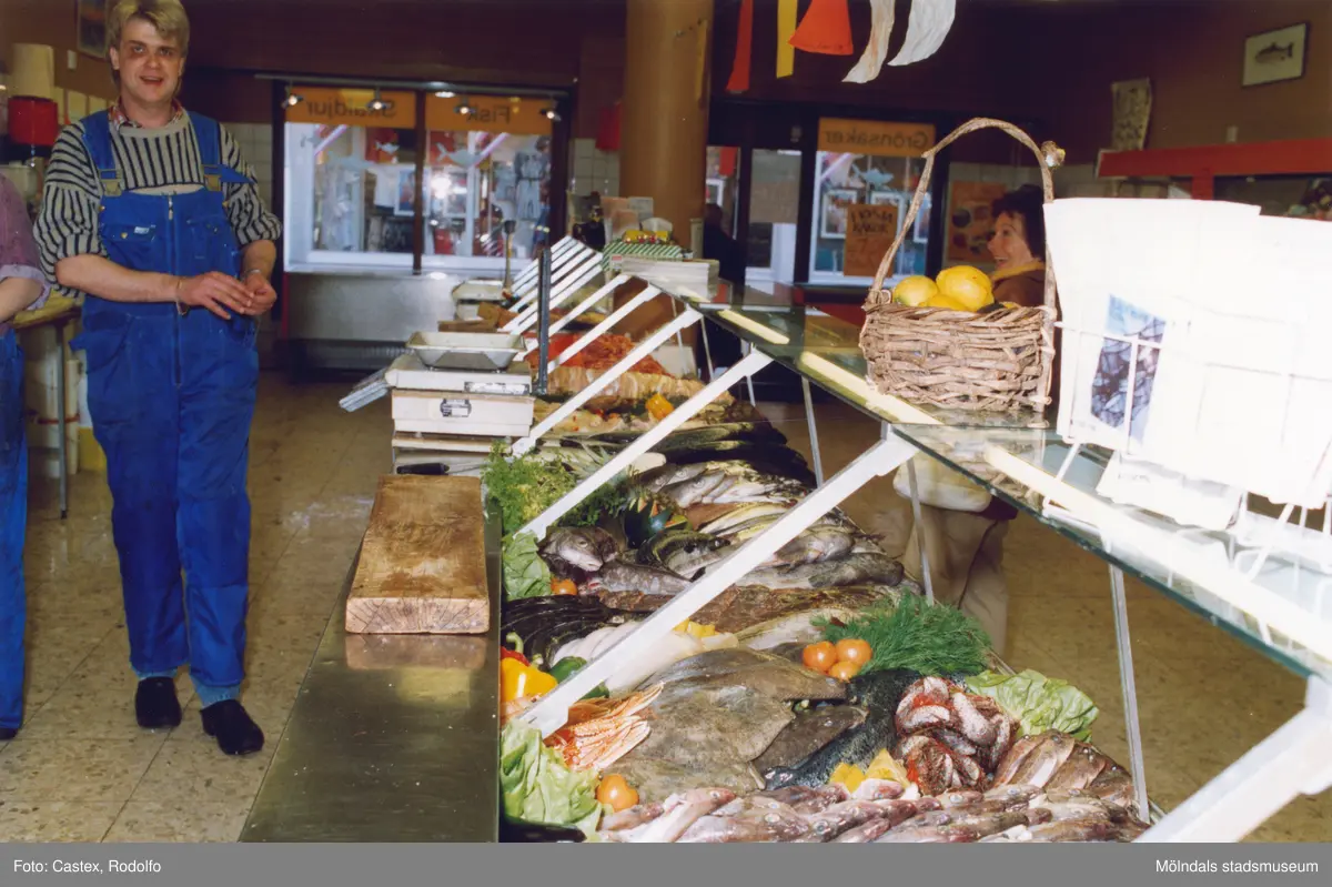 Fiskaffären i Mölndals centrum den 10 maj 1991. Butikspersonal bakom fiskdisken.