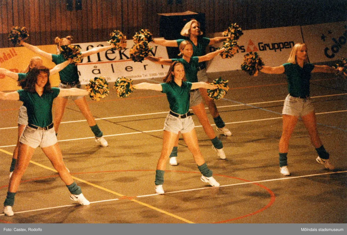 Titel: Kvarnby Basket Cheerleaders uppträder i Mölndals idrottshus/Aktiviteten, år 1996.