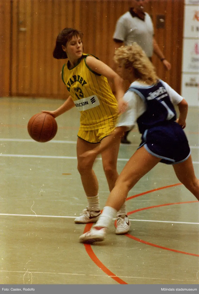 Titel: Kvarnby Basket spelar match i Mölndals idrottshus/Aktiviteten på 1980-talet. Motståndarlag och slutresultat är okända.