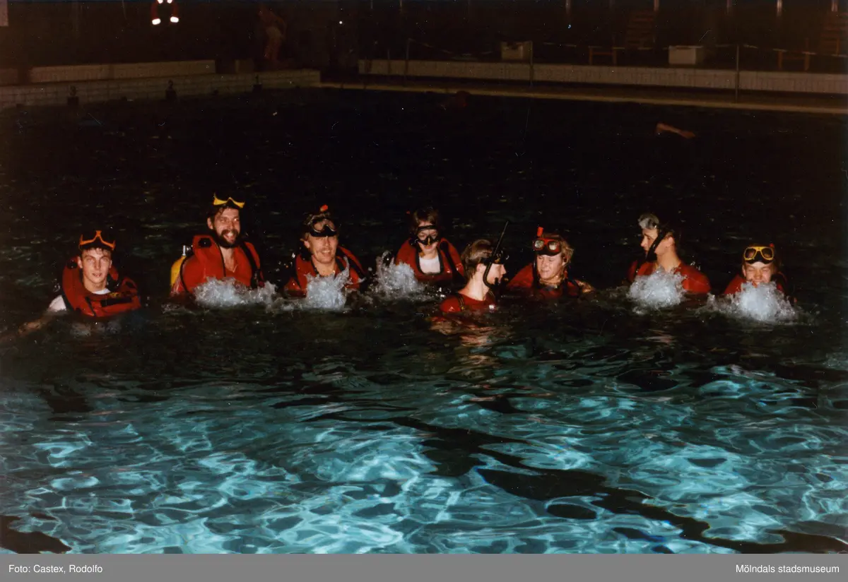 Medlemmar i Lindome Sportdykarklubb övar dykning i Åby simhall i Åby, Mölndal, år 1983. Grupporträtt i bassängen.