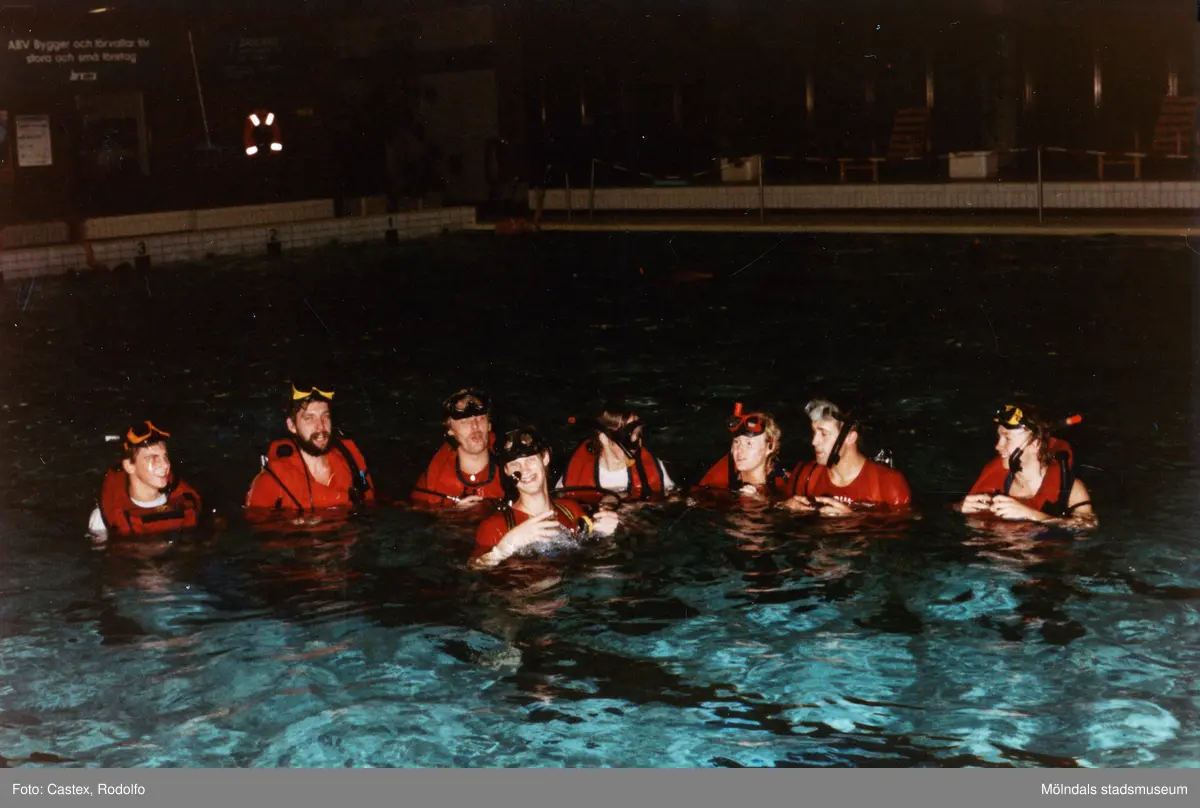 Medlemmar i Lindome Sportdykarklubb övar dykning i Åby simhall i Åby, Mölndal, år 1983. Grupporträtt i bassängen.