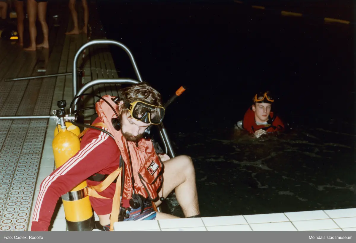 Titel: Medlemmar i Lindome Sportdykarklubb övar dykning i Åby simhall i Åby, Mölndal, år 1983.