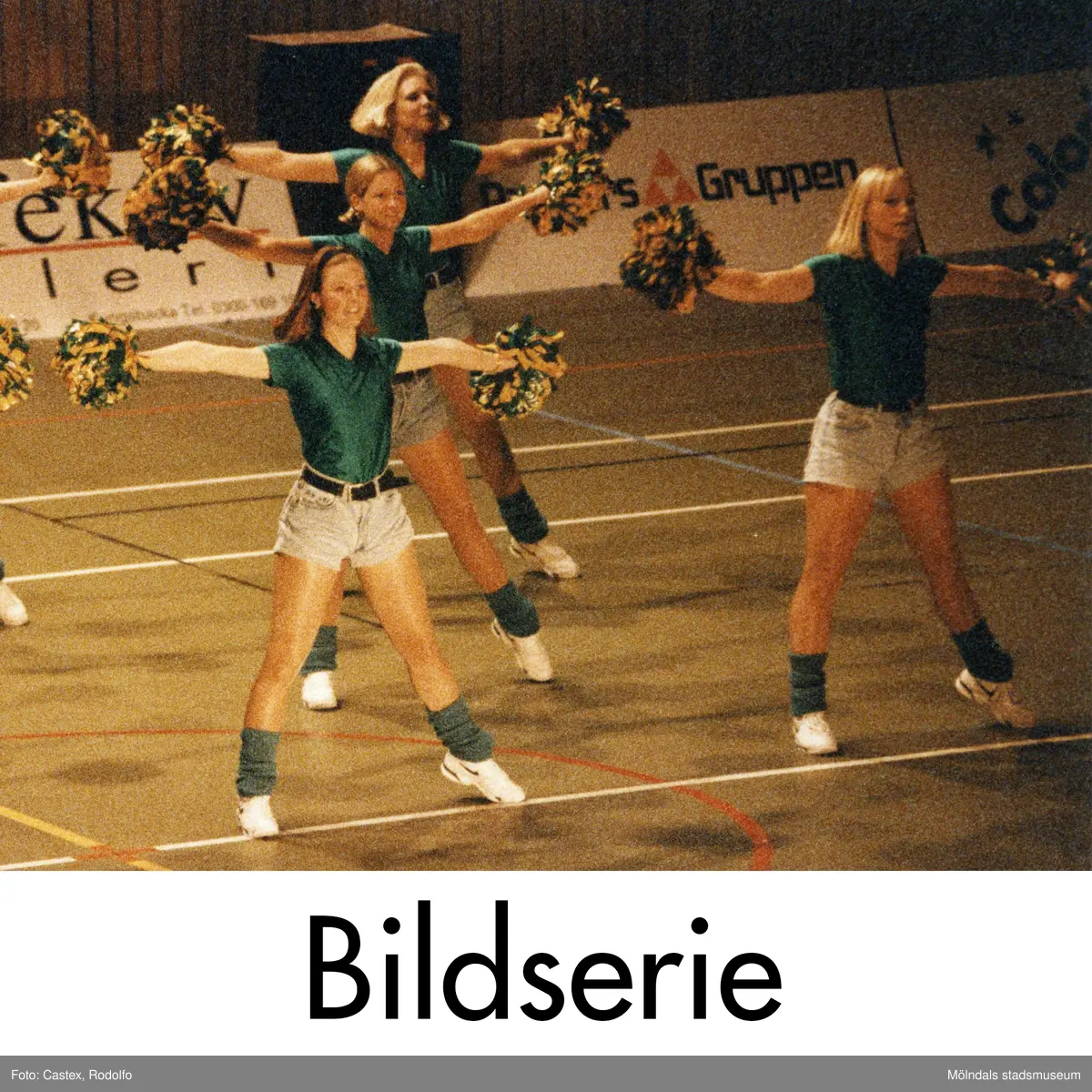 Serie om tre fotografier som visar Kvarnby Basket Cheerleaders uppträda i Mölndals idrottshus/Aktiviteten, år 1996.