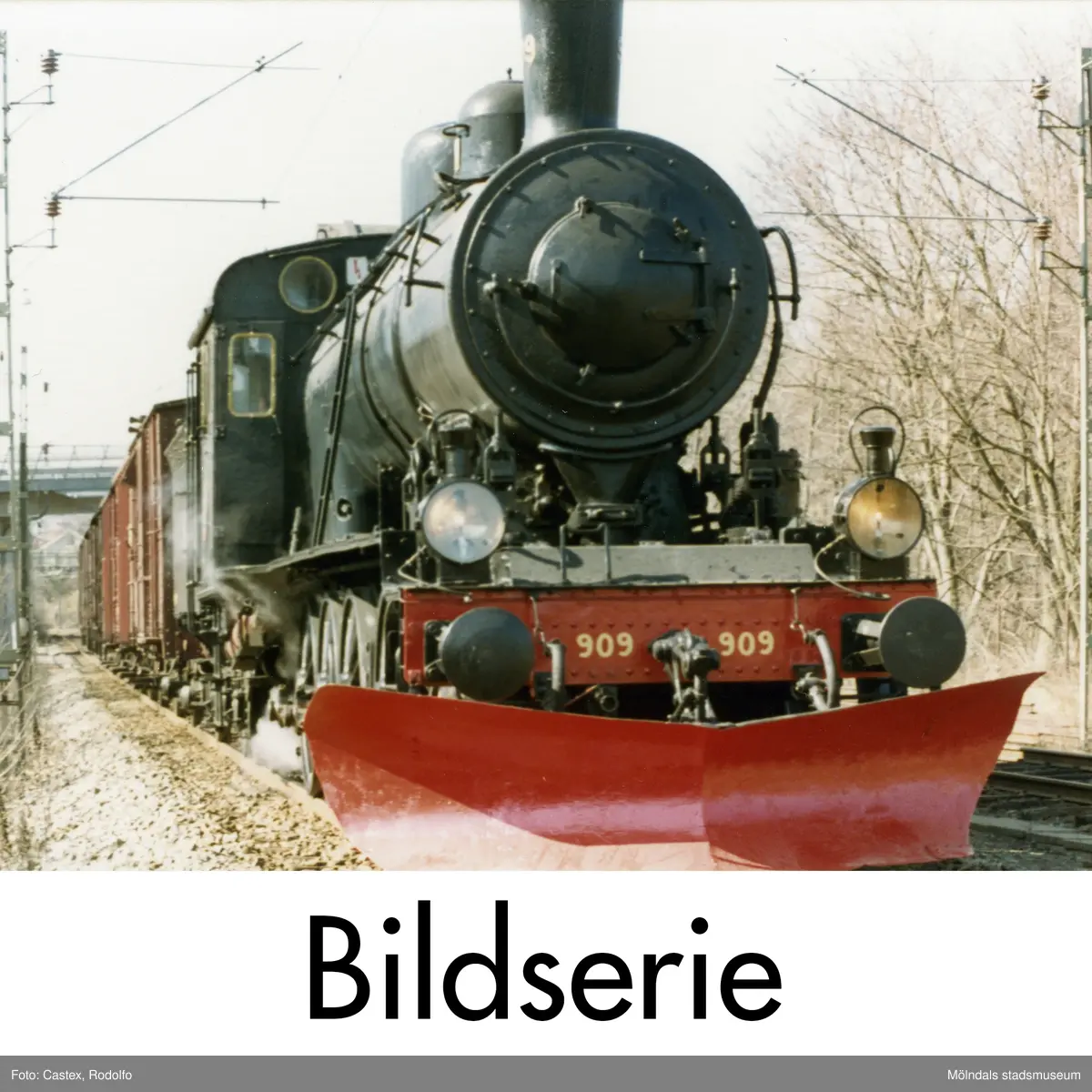 Serie om 16 fotografier som visar ett ånglok på besök i närheten av Mölndals Övre järnvägsstation i april 1982.