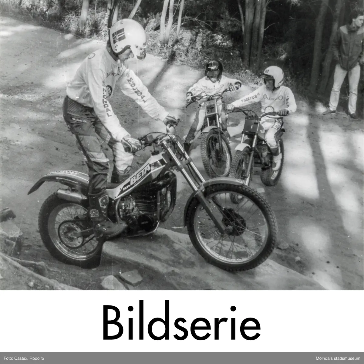 Serie om 16 svartvita fotografier som visar trial vid Blixåsbanan i Balltorp, Mölndal, okänt årtal.