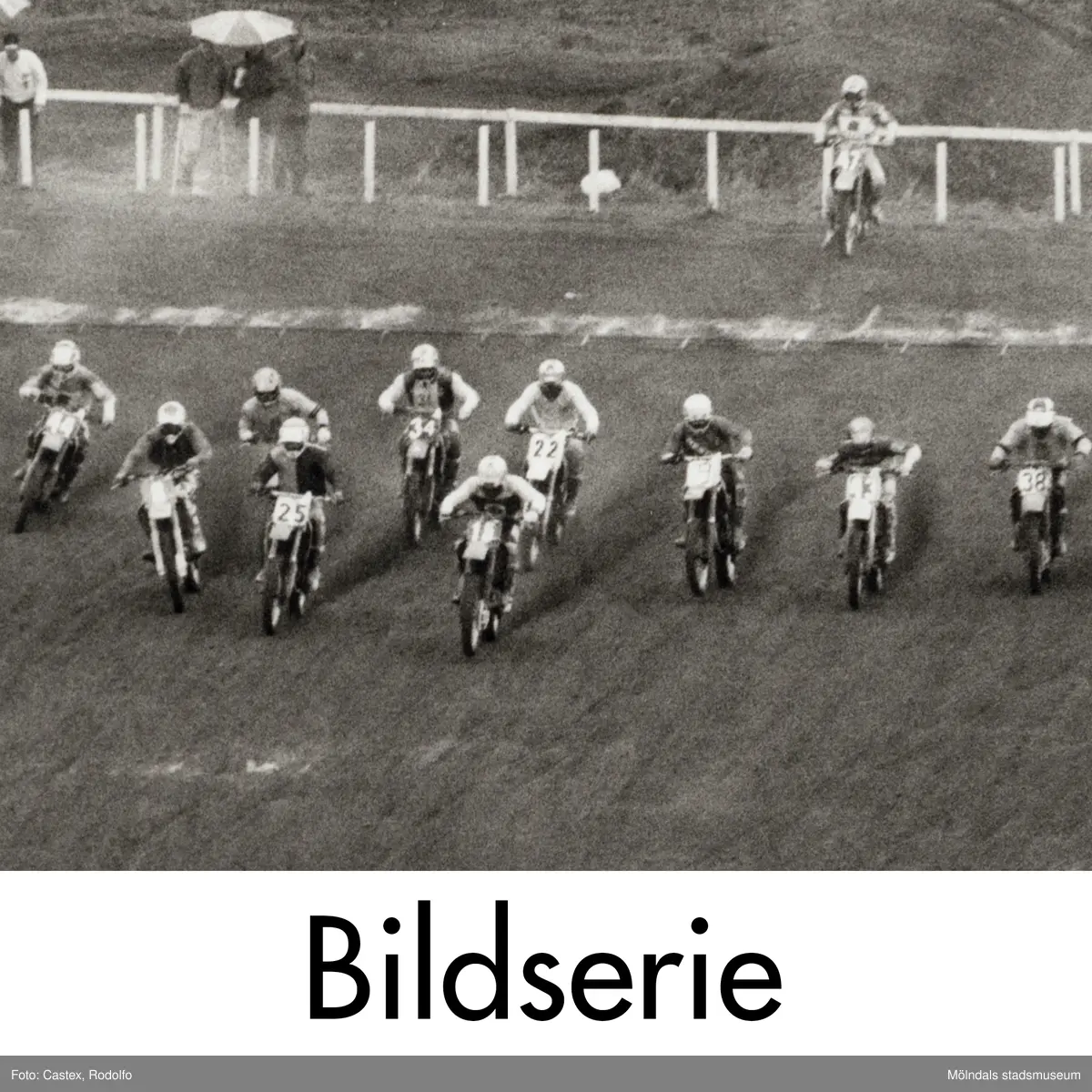 Serie om 18 svartvita fotografier som visar motocrosstävling på Blixåsbanan i Balltorp, Mölndal, okänt årtal.