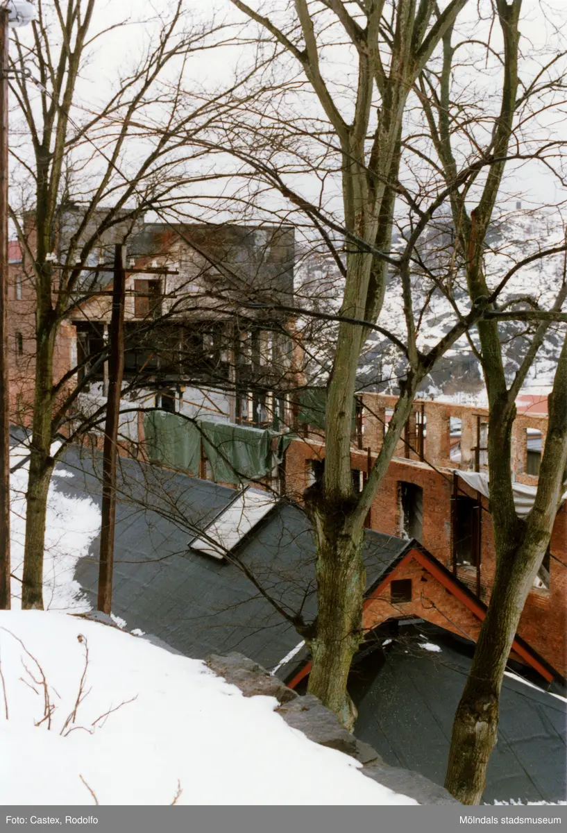 Industribebyggelse vid Götaforsliden i Mölndals Kvarnby, vintern 1988. Stora Götafors är fortfarande skadat efter branden den 4 juni 1986.