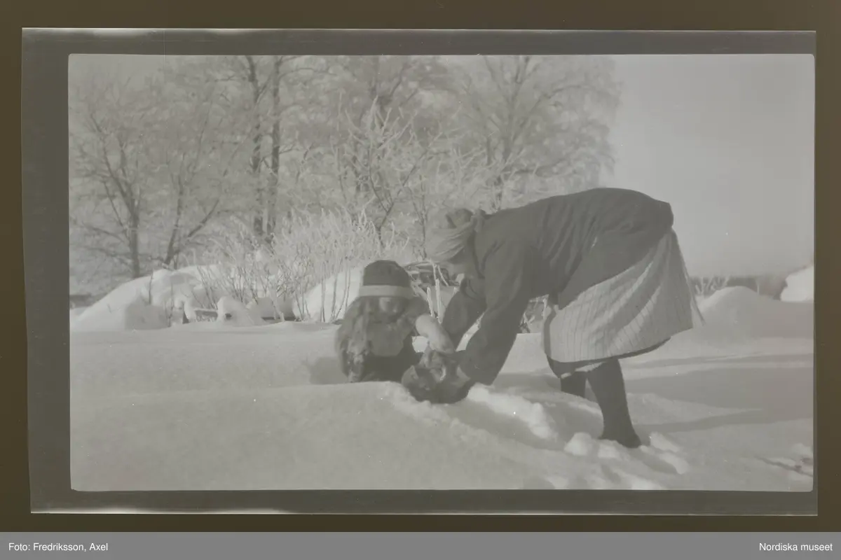 Anna-Lisa sitter i en snödriva, och fotografens fru Frida Fredriksson böjer sig för att lyfta upp en katt.