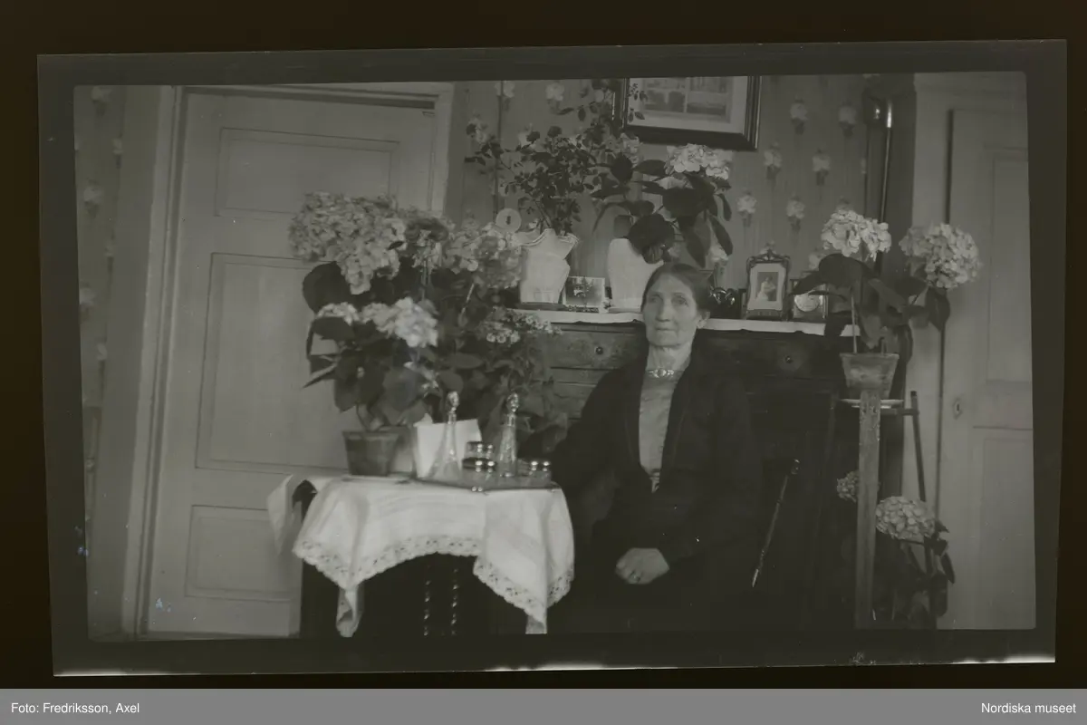 En kvinna sitter i ett rum, omkring henne står blommor.