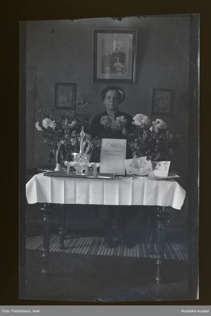 En man sitter vid ett bord med 50-års gratulationskort, telegram och blommor i vaser.