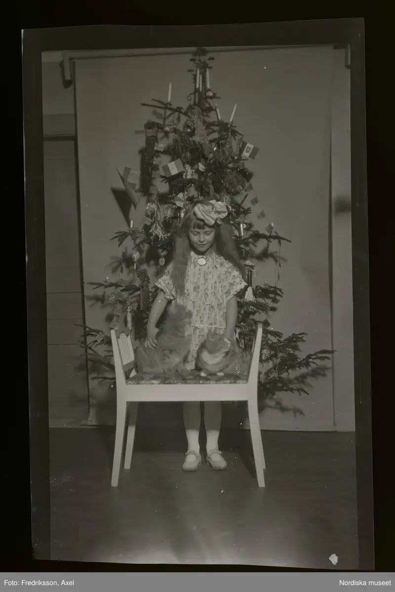 Porträtt av Frida Anna Elisabeth (kallad Anna-Lisa) Fredriksson framför en julgran tillsammans med två katter.
