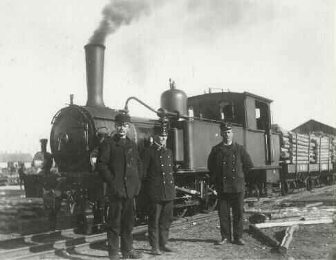 Framför lok nr 7 står fr. v. Putsare Alfred Hansson, stationskarlarna Pergel och Johansson.