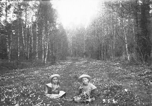 Flickorna Karin och Greta Persson på vårpromenad i skogen.