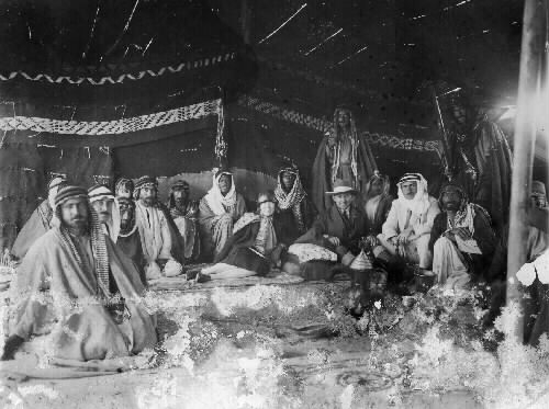 Text på baksidan av bild 1: Jaktsällskap i öknen.Två fr.v. Karin Johnsson. Bild 2: Jaktsällskap återvänder, längst t.v. HARITH Ibn Hassan, schejk.