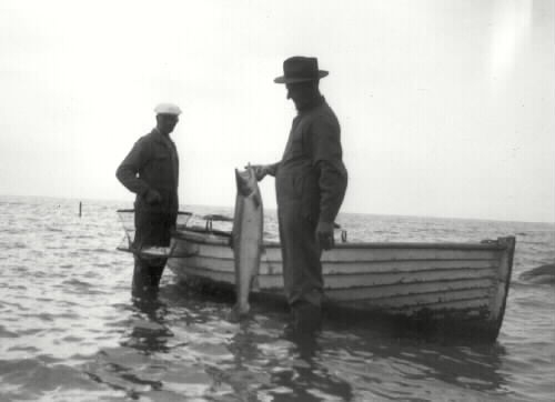 Fr.v. Otto Pettersson och hans kusin från Amerika Otto Larsson. Otto P bär en speciell nätkasse för mindre fisk.