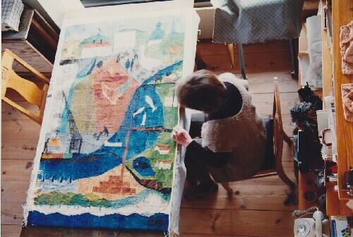 Brita Stranne lägger en sista hand på konstverket. Museet hade vid invigningen fått en penninggåva från Falkenbergs Sparbank för en del av den beställdes detta konsthantverk. Fler bilder finns i fotopärm.