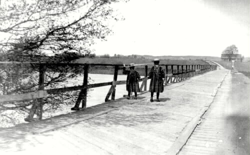 Träbron gick över Ätran strax norr om nuvarande bron (bron för väg nr 767 ). Bron fanns kring sekelskiftet 1900. Personerna på bilden lär vara systrarna Jönsson, döttrar till tullförvaltare Jönsson på St Lars Kyrkogata