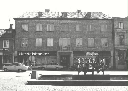 På denna tomt uppförde AB Dan Lundgrens Läderfabriken affärs- och bostadsbyggnad 1936. Affären Läderbolaget var inrymd i den vänstra delen där Handelsbanks skylt syns och till vänster affären SkoDon.