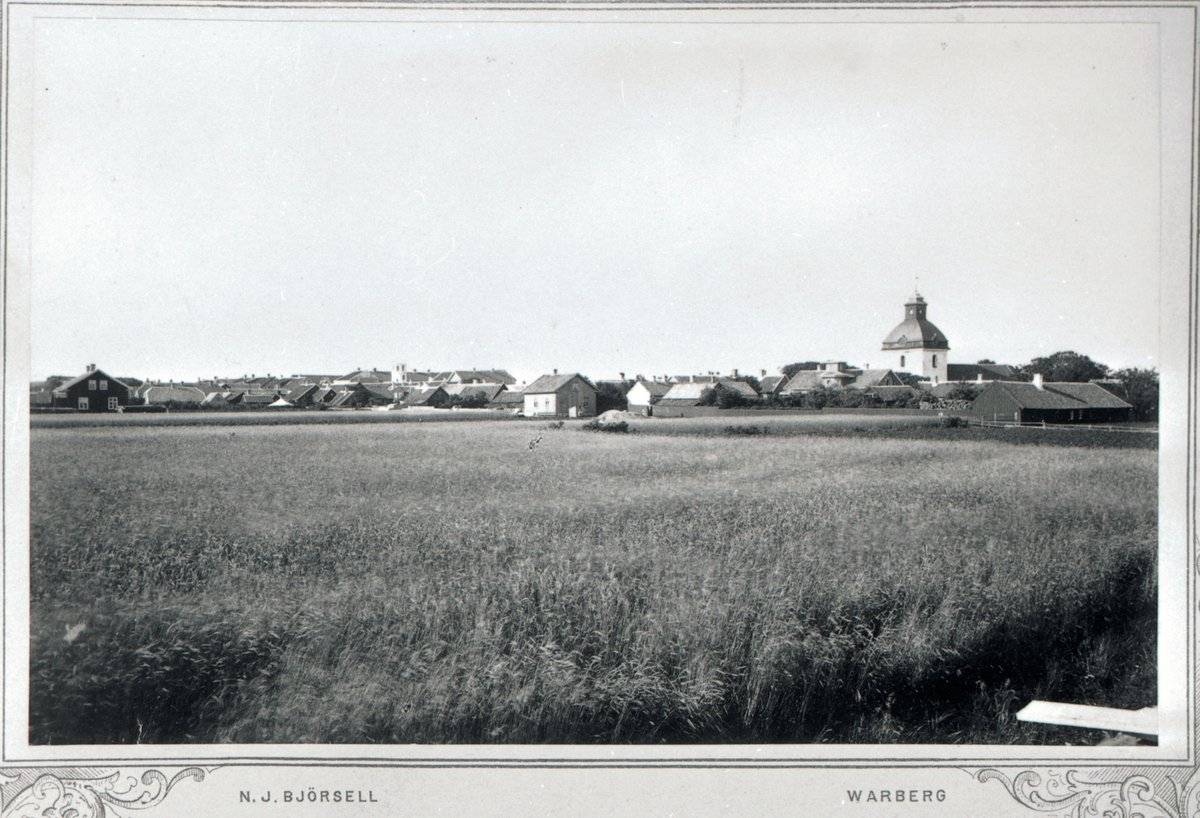 Falkenberg sett från dagens stadsdel Västra Gärdet, med S:t Laurentii kyrkan t.h.