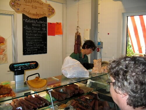Bild 1:Gudmundsgården i Slöinge säljer egenproducerat charkuteri. En av ägarna, Sabine Tebaay, betjänar här Birgitta Wikander. Bild 2:Ralf Tebaay tar emot inne i charktillverkningen och guidar besökare i tillverkningens olika moment.