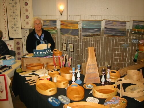 En utställning anordnades av Årstad Hembygds- förening i Heberg 2002.En av många utställare, Barbro Håkansson, visar sina vävar och maken Arne Håkansson ställde ut sina skickligt gjorda träarbeten.