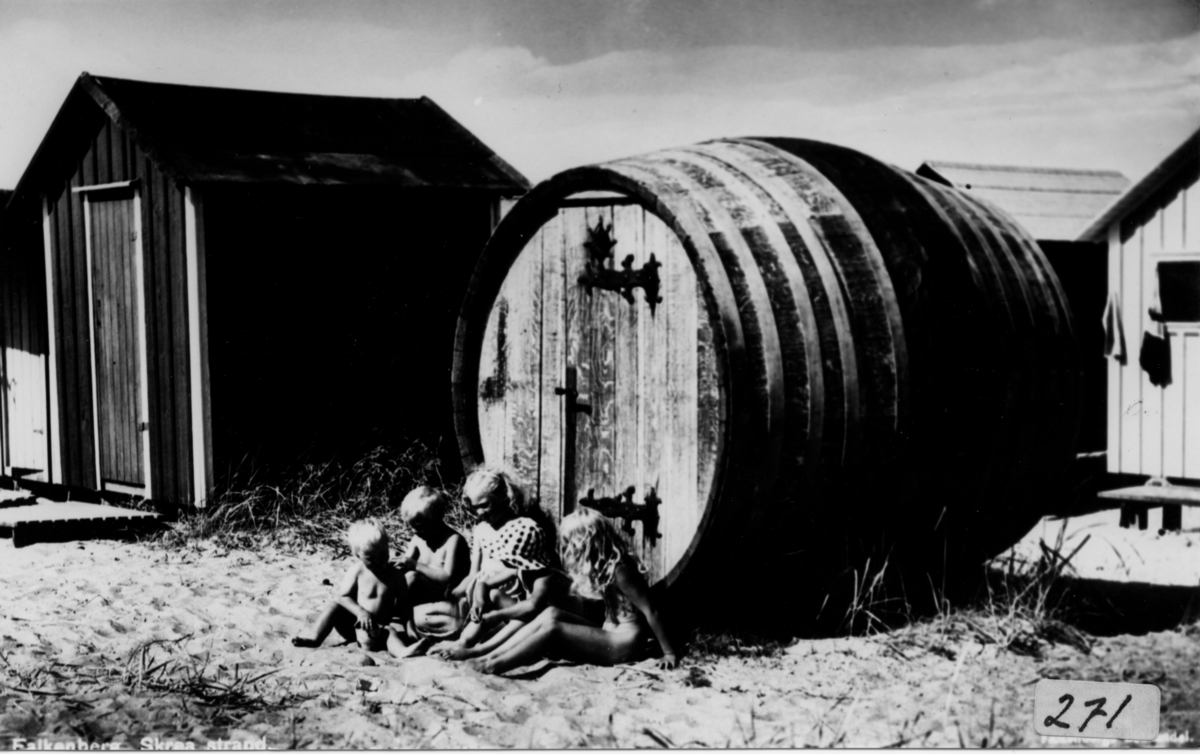 Badhytt, Skrea strand. Barnen framför kommer från Ullared, flickan med den rutiga hatten är Stina Åkerström. Den låg på gamla området, före V&S anläggningen.
