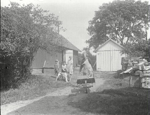 Uthusen vid Skrea skola tillhörande lärarbostads delen. Barnen Persson fr.v. Britta, Pelle, Greta, Karin och Einar.