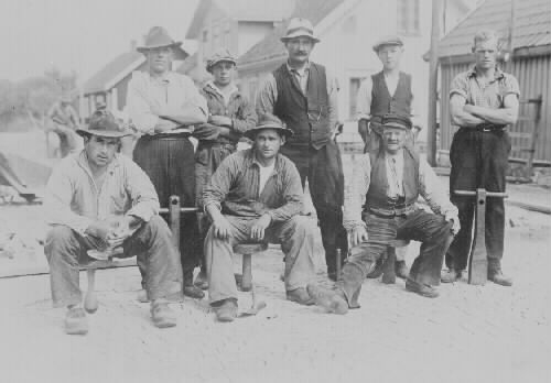 Stensättning av Varbergsvägen. Stående fr.v. Olle från Forserum var stöttare (stötte med jungfru), WISÈN Stig plockade fram gatsten, ANDERSSON "Attarparn" Karl körde fram gatsten, NILSSON "Villes-Erik" Erik plockade fram gatsten och JOHANSSON Axel var stöttare. Sittande fr.v. BENGTSSON Bengt, WISÈN Viktor (far till Stig W) och JOHANSSON Karl satte gatsten. Olle fr. Forserum och B Bengtsson var inlånade stensättare.