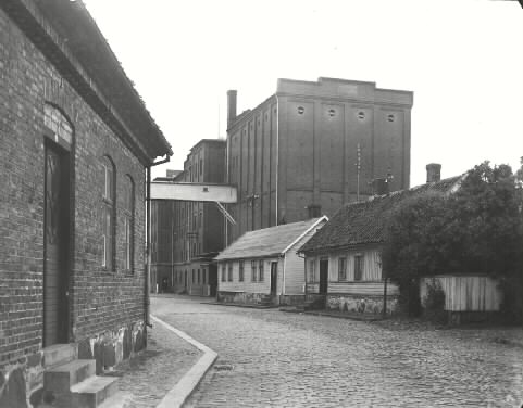 Byggnadsår Valskvarnen 1904-1906, ombyggnader bl a 1960 och tillbyggnader 1980-84. Byggherre Falkenbergs Valskvarn. Byggnaden längst till höger Låset 2 byggdes 1850. Byggherre H J Törngren. Huset flyttat till kv Liljan 4 1983. Låset 3 uppfört 1850, byggherre sjömannen P Lilljenstam. Huset rivet i början av 1980 talet. Huset till vänster Rian 9 uppfört 1873 av Bengt Johan Swensson. Huset rivits 1984.