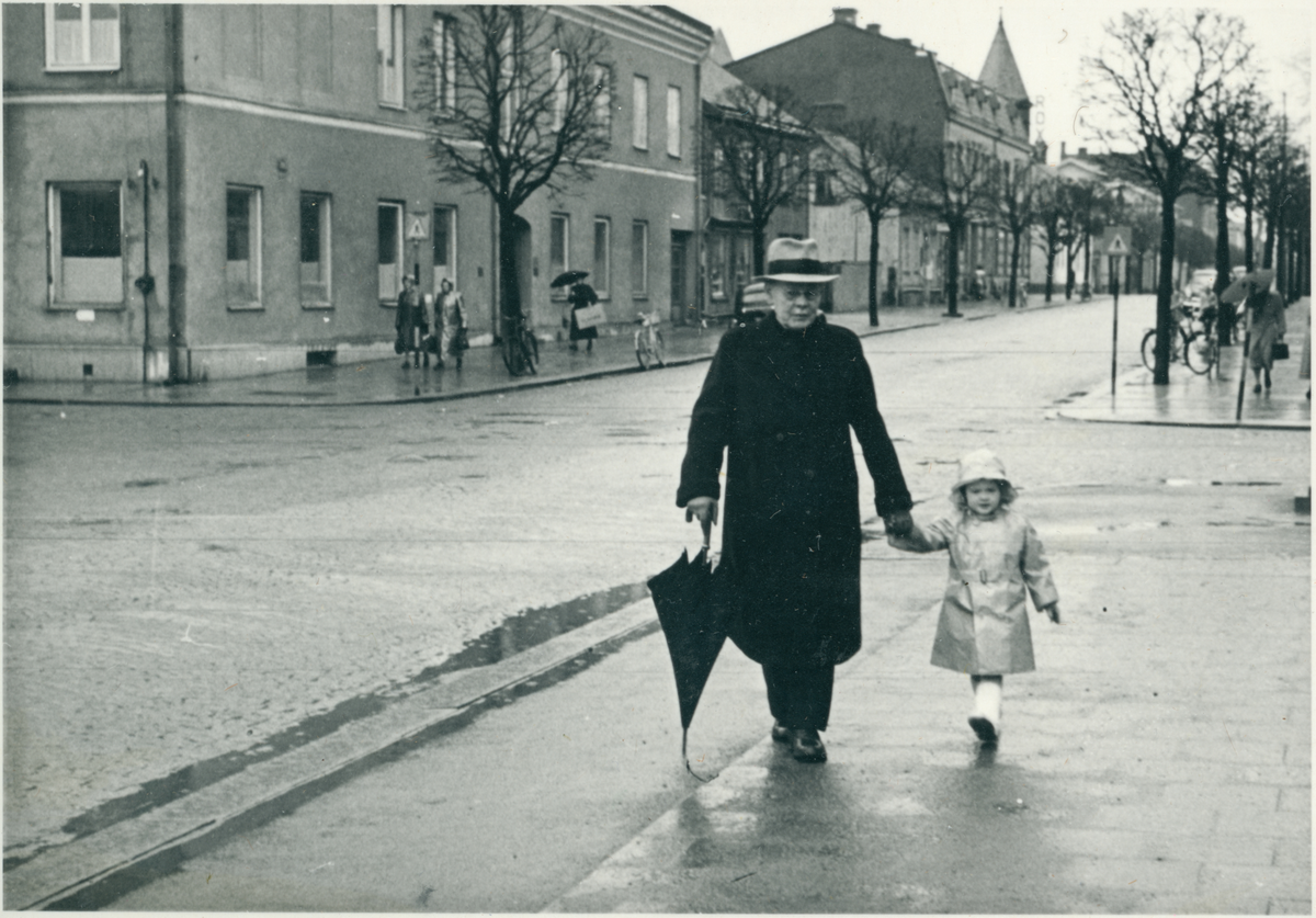 Vänersborg. Torborg på promenad med sin morfar Georg Nyström