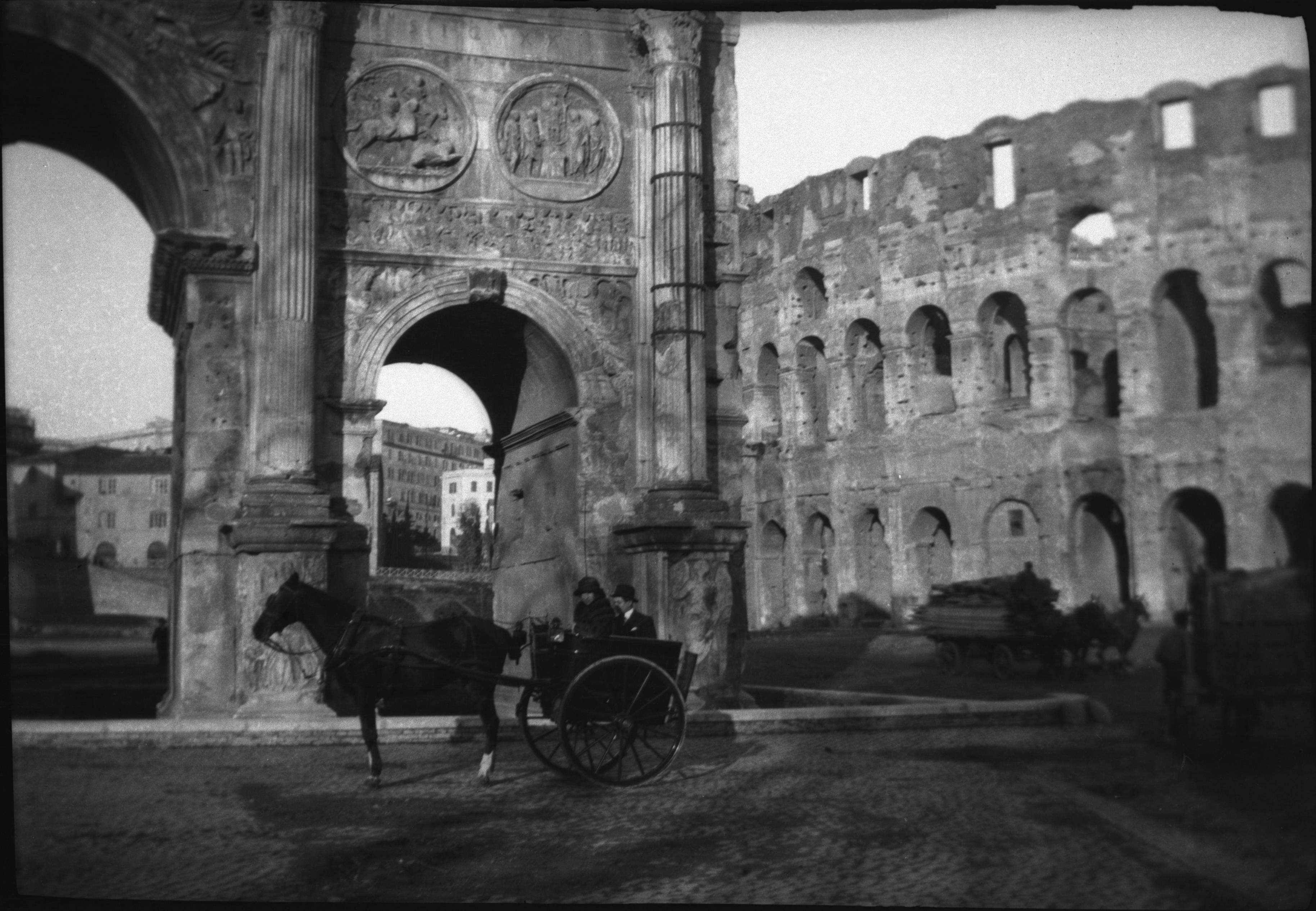 Häst med vagn vid kejsar Konstantins triumfbåge och Colosseum.