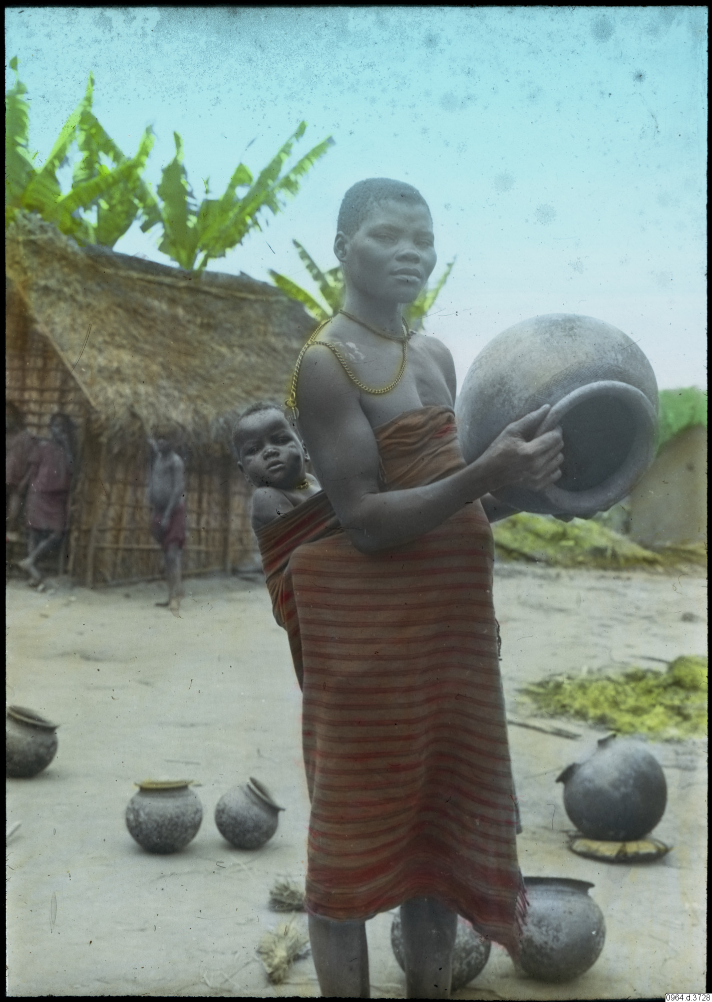 Kvinna med lerkruka i handen och ett barn på ryggen.