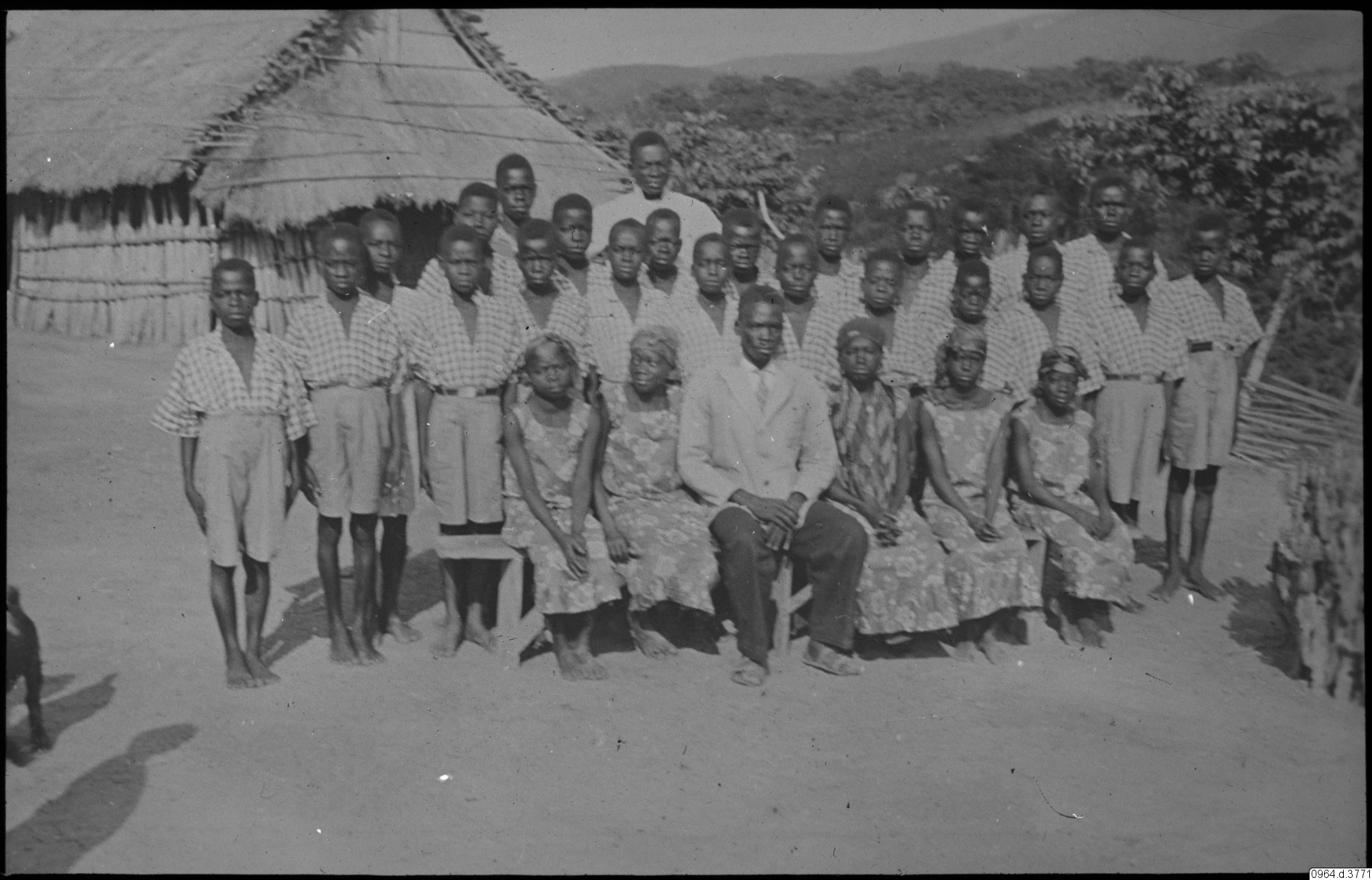 lärare, elever, byggnad, gruppbild, hydda, fotografi, photograph