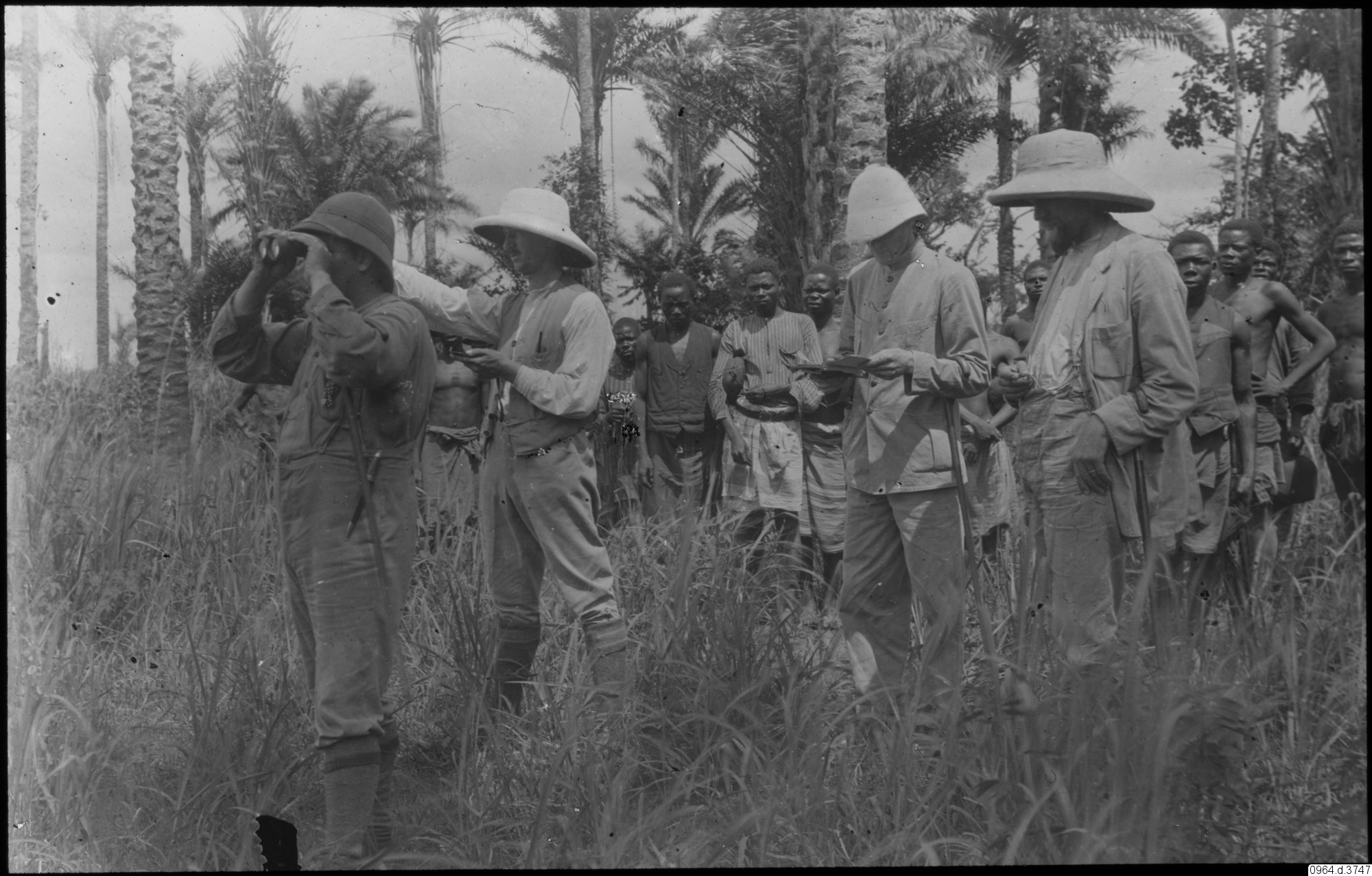 kikare, kompass, gruppbild, bärare, tropikhatt, missionärer, fotografi, photograph