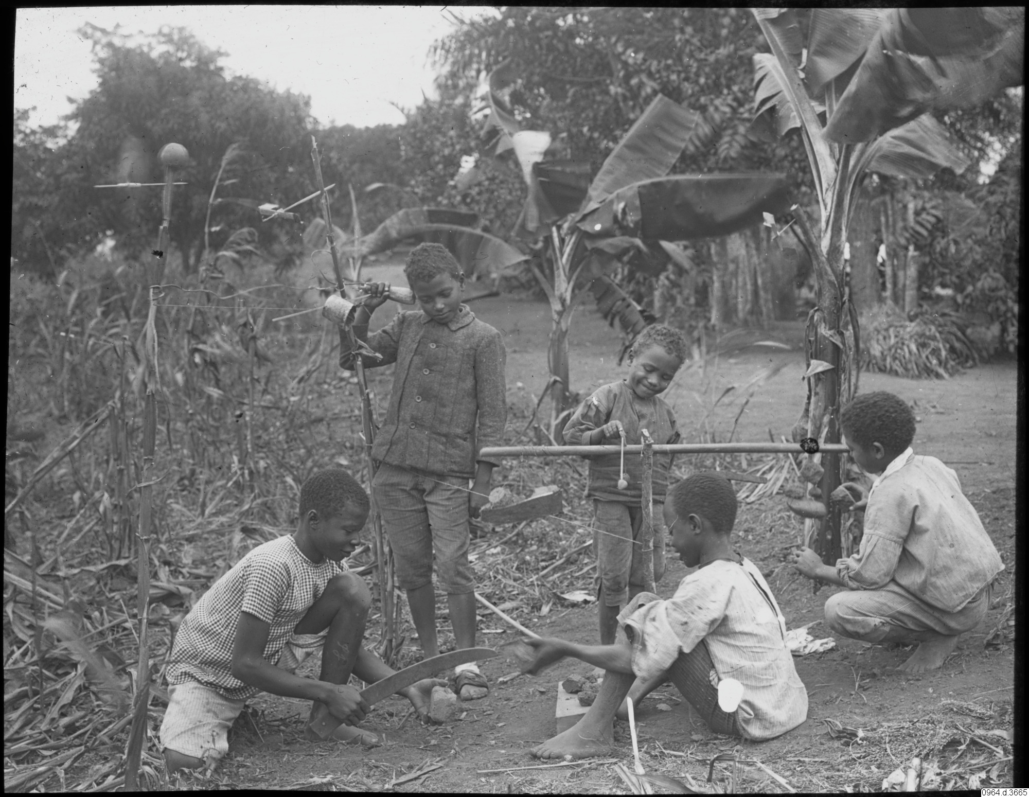 Mulattbarn leka handelsbod. Mukimbungu. Mulatterna leka telefon och balansering.