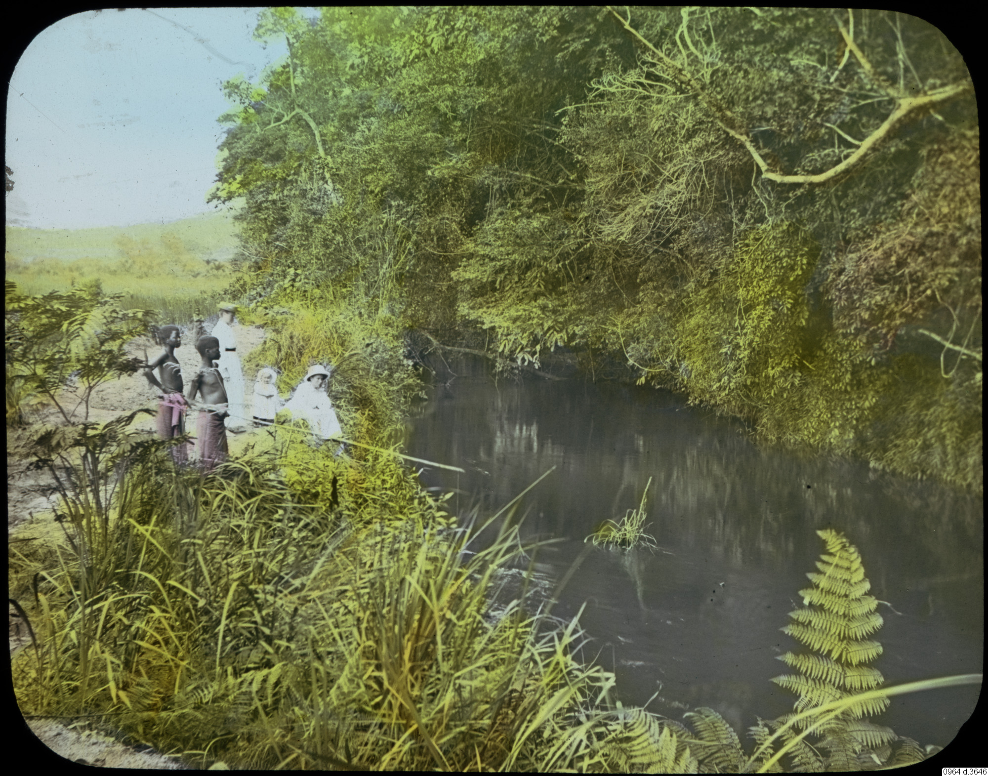 gruppbild, fiskare, vatten, missionärer, strand, barn, fotografi, photograph
