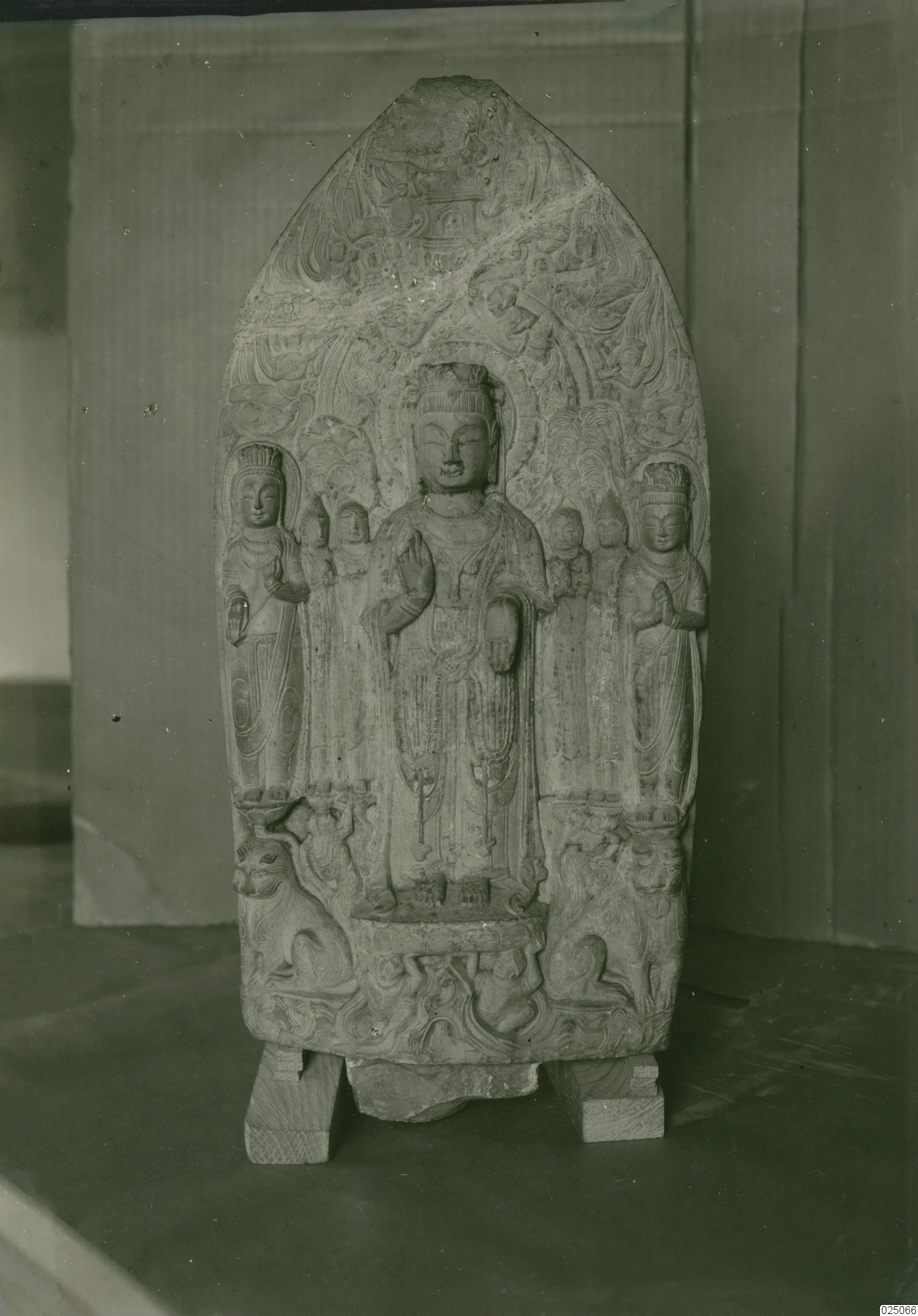 Skulptur/stele i sten. Föreställer en stående bodhisattva med munkar bredvid sig på båda sidor. Norra Zhou-dynastin.