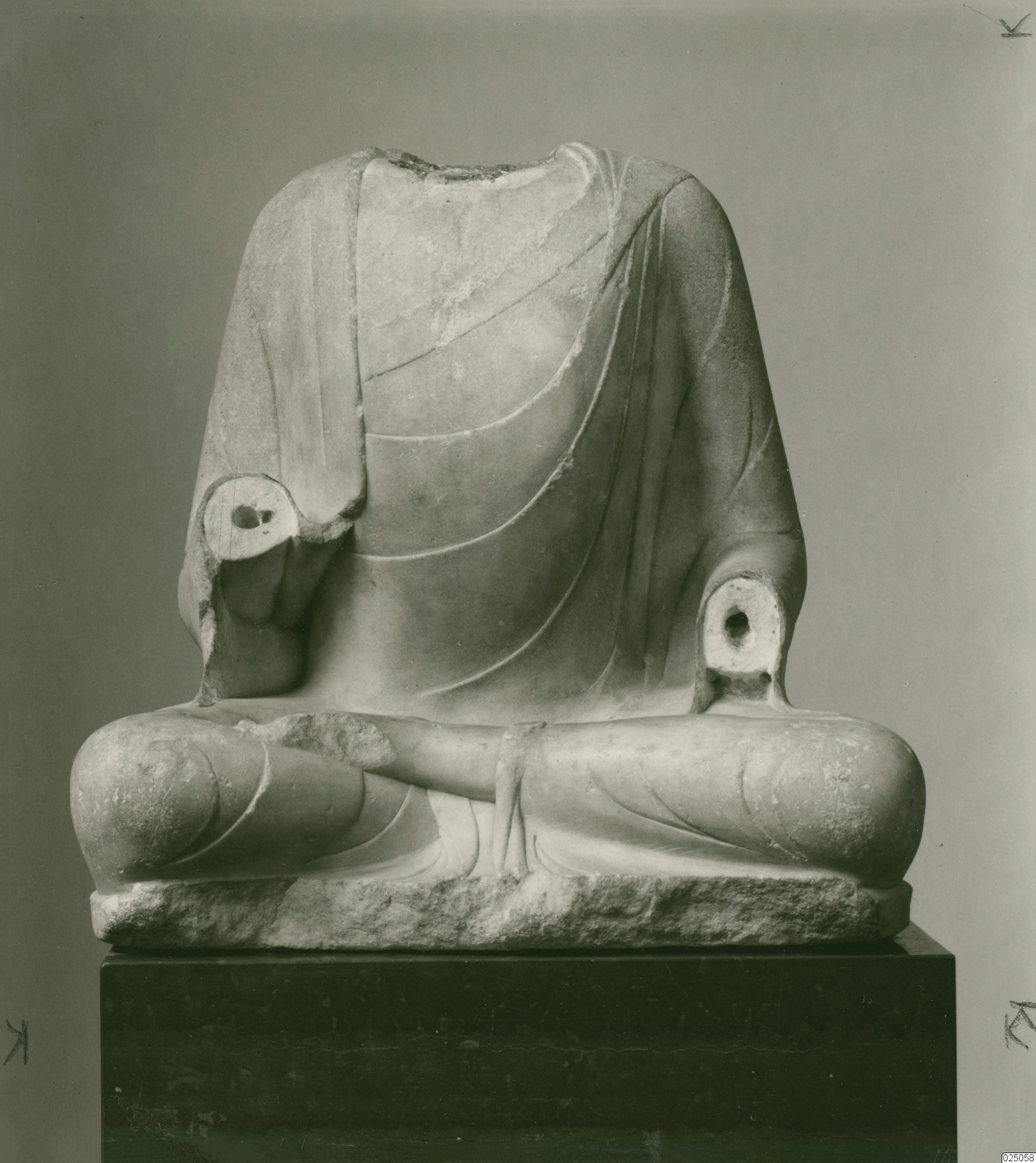 Staty/skulptur i vit marmor. Föreställer en sittande Buddhafigur som saknar huvud och armar. Sui-dynastin.