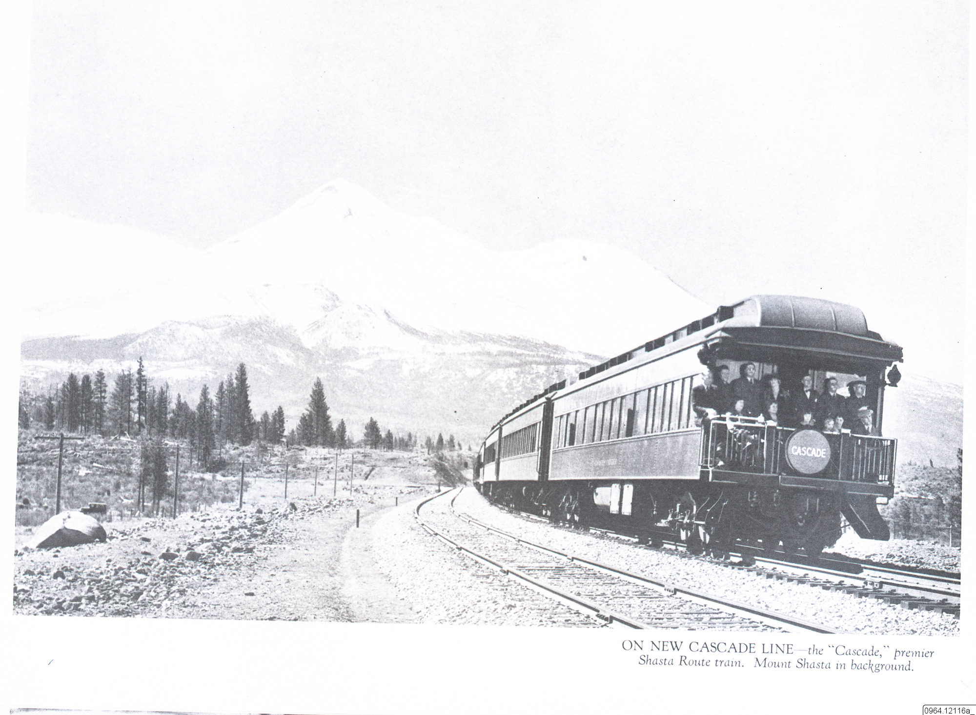 On new Cascade line, the cascade premier, Shasta route train. Mount Shasta in background.