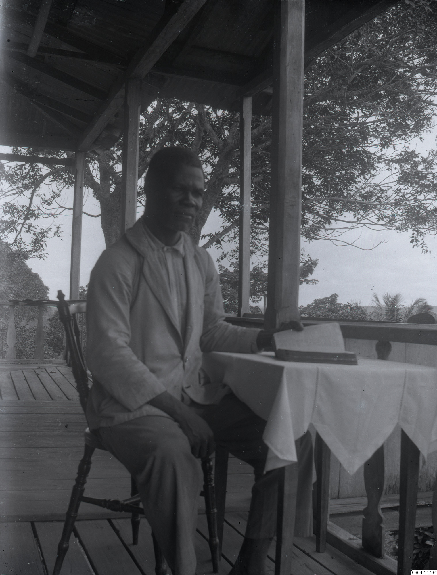 Man som sitter på stol vid bord med bok på veranda.