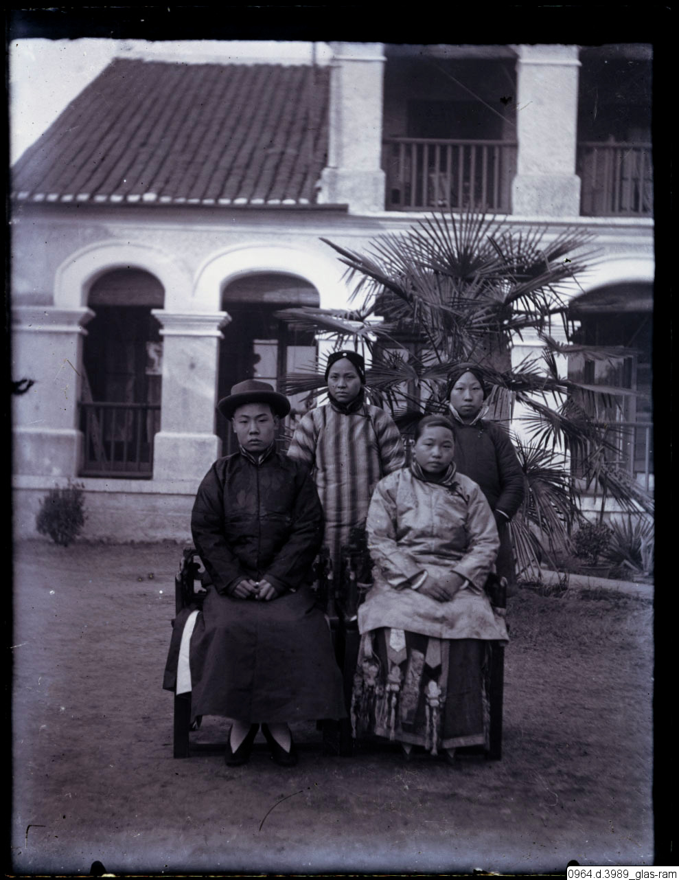 Personer i traditionella kinesiska kläder framför byggnad på missionsstation.