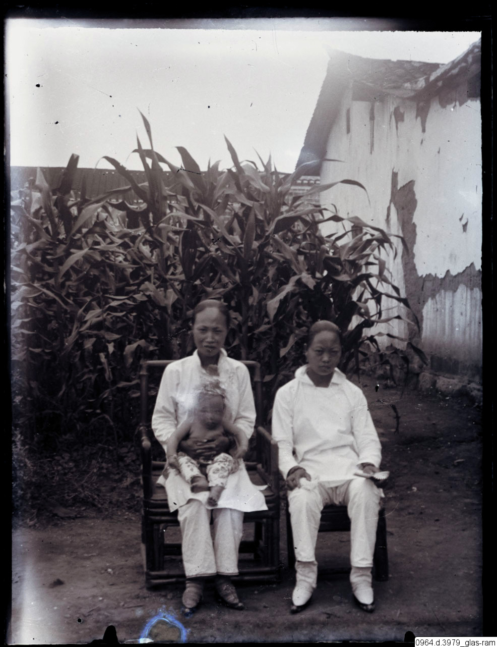 Porträtt av två kvinnor, en med ett spädbarn i famnen, framför odling och byggnader.